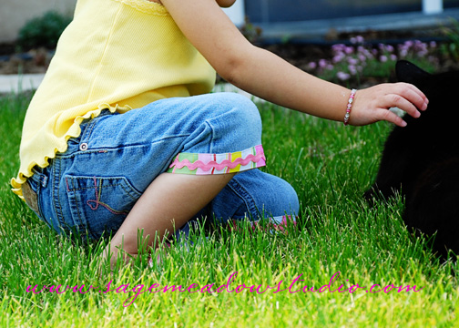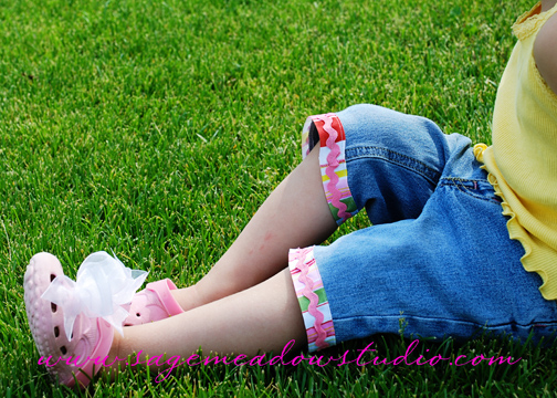 I think summer is FINALLY here! The long, cold spring has left me less than anxious to run out and acquire summer clothing for the kiddos, but I gave in and picked up a few things last week. Even with the new additions to our wardrobe, the rigors of potty-training seem to keep our favorites forever in laundry baskets. Today, following an ‘accident’ I pulled out a pair of barely-too-short jeans and cut them off to add to our warm weather repertoire. I didn’t feel like waiting to wash them to get the stand-by fringed denim look, so I pulled out a ribbon I’ve been dying to use and came up with this:
