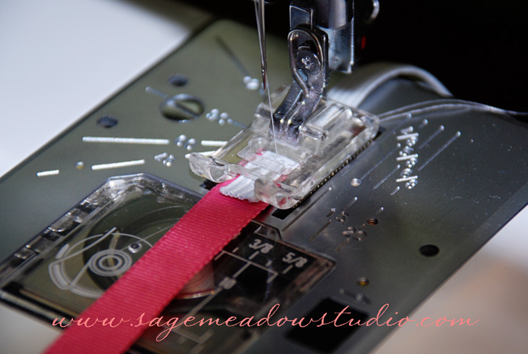I didn’t have enough ribbon to go entirely around her waist, so I grabbed a bit of 1/4″ elastic and tacked my ribbon to each end: