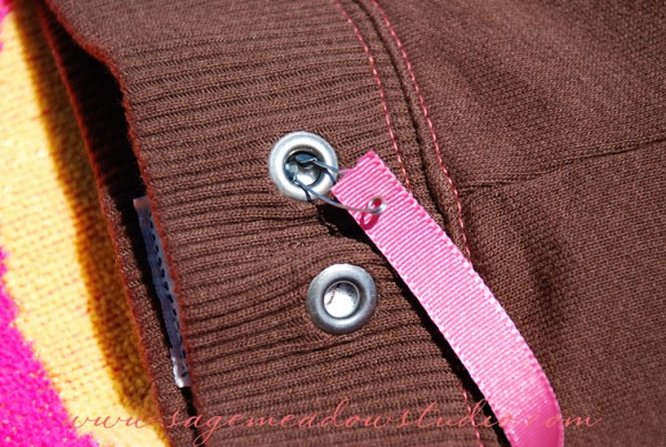 To be sure it won’t come apart, I hit the ends of the ribbon and the elastic with a bit of Fray Check. The new drawstring looked like this when I was finished:
