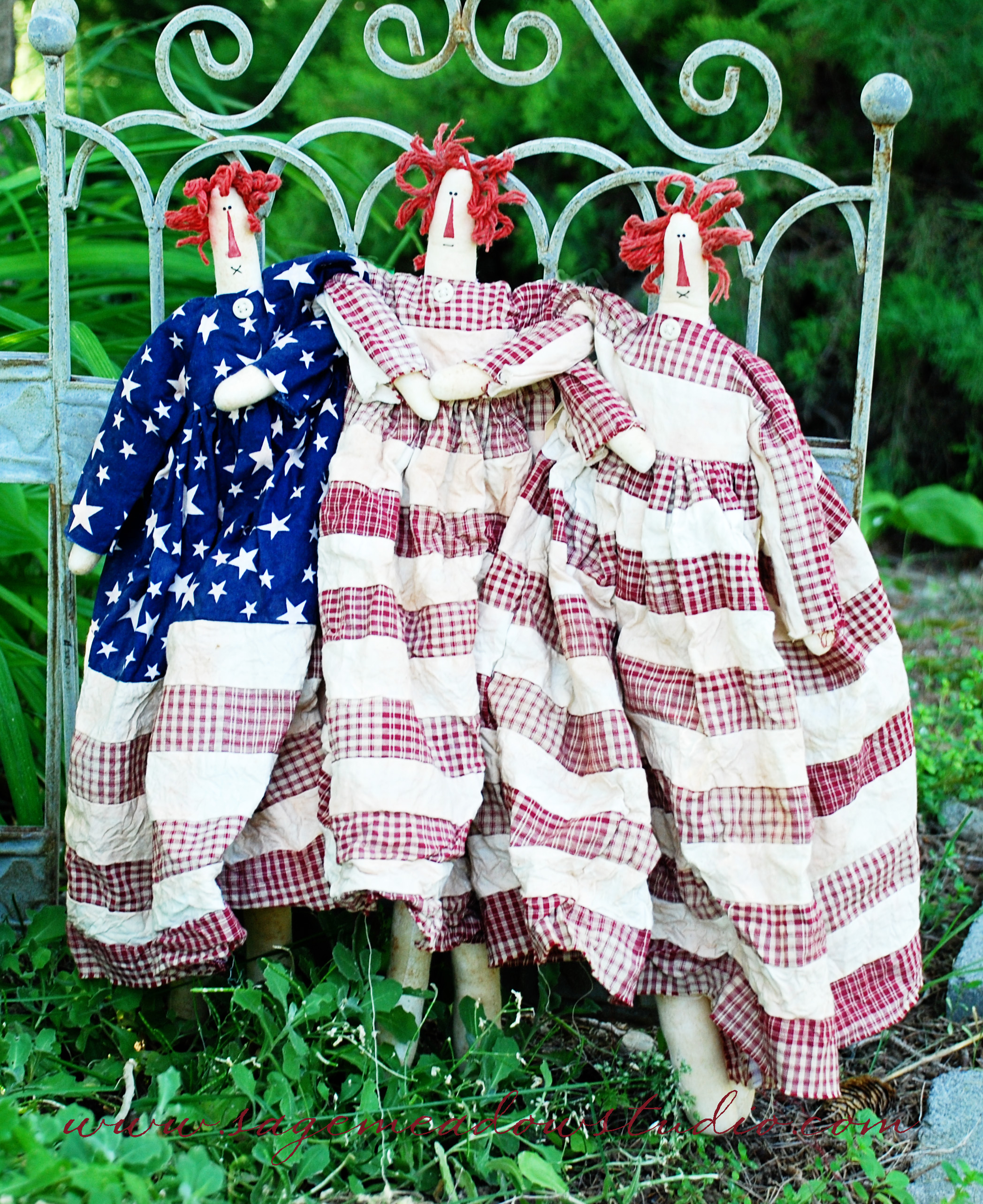 I found these sweet patriotic sisters at a local craft fair a few years ago, and couldn’t resist bringing them home with me. I love primitive softies, and the flag motif of these raggedies is very clever, don’t you think? I wish I knew who crafted them…but there was a pattern listed on the tag still attached in back, and I am in love with pretty much everything on that designer’s site.