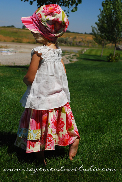 So I promised a cute top out of this Ginger Blossom fabric by Sandi Henderson…but the cute top turned into a sweet little hat, a pair of bloomers, a couple of twirly skirts for my girls, and a bag for me (still in the works, but I’m so excited about it!). I love looking at these colors together, and have been kicking myself for letting my little stash simmer for so long. It’s been perfectly lovely to sit and create with.