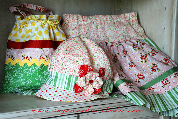 I’m heading out for a fun family gathering today and won’t be back ’till Sunday, but wanted to leave you with a picture of the last of the niece birthday bags…with its matching hat and skirt. I think I might be having too much fun with these, I just can’t get enough!