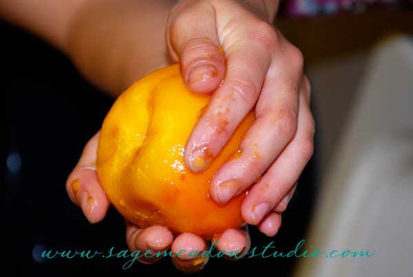 Ta-da! I finally did it…I canned something. Inspired by a lovely bowl of freshly canned peaches at the home of my friend’s parents on my weekend visit to the Seattle area (mmm…they were really good with that grilled cheese sandwich…funny how things taste so much better when someone else cooks!), I found myself a couple boxes of Utah peaches, rounded up the supplies I needed, googled a recipe, and dug in late last Friday night. To my surprise, my husband jumped right in and helped me figure it all out. We made it through one box that night, and then Miss J helped me with the last box on Monday night–she peeled all those peaches herself, and it went nice and smooth.