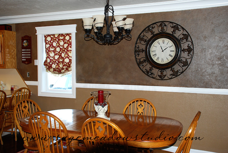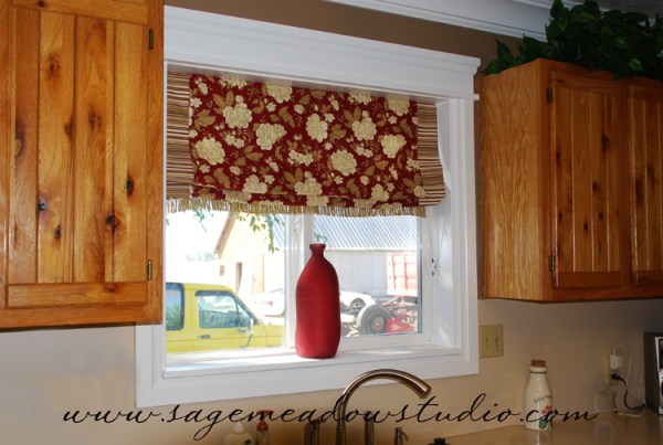 When my dear mother-in-law decided to rip down the 14-year-old wallpaper in her dining room and kitchen to make way for some new texture and color on her walls this summer, she didn’t know she was getting herself in for a bottomless remodel project! She ended up with new texture, color, pretty new trim, new flooring, and new fixtures in the bathroom just off the kitchen to boot! The project is finally finished…it just needed a few finishing touches, so I volunteered to provide some pretty roman shades for the windows.