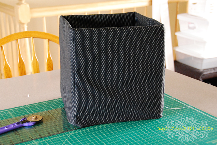 I worked on a major overhaul of my sewing space over the holiday weekend (yay!). It’s not completely finished yet, but I thought I’d share the process I used to create a big element of the re-do: cute storage using stuff I already had. Okay, so I bought the fabric, but I already had these fabric storage bins (I originally purchased them for another room, and never used or returned them), and did not want to spend more time or money on searching for the perfect organizing supplies. Here’s how it goes: