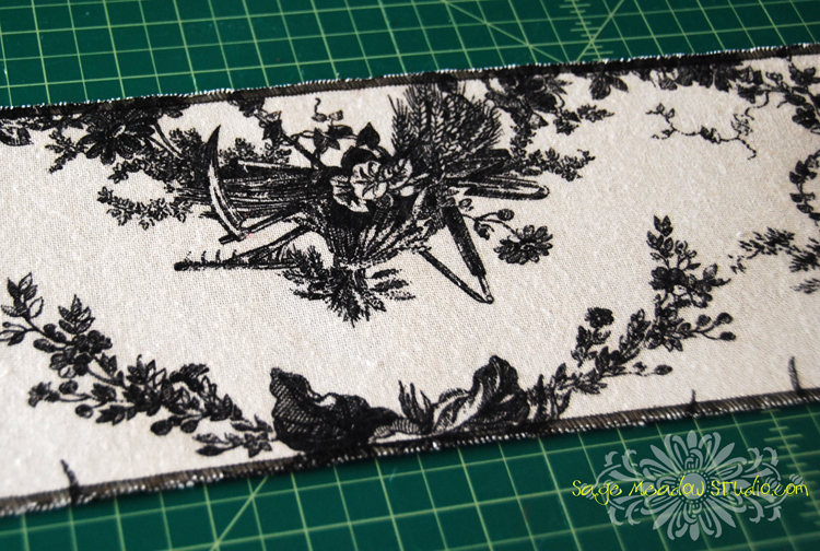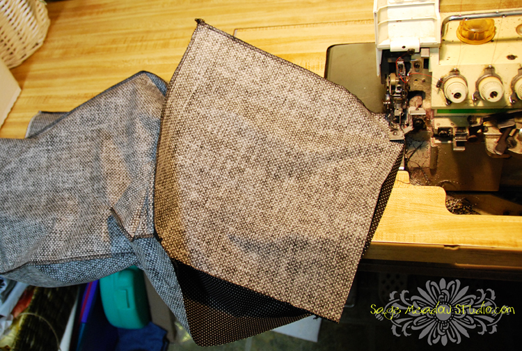 I decided to decorate these boxes with more fabric, and wanted a slightly rustic look, so I serged the edges of 6″ strips of toile with my trusty black thread: