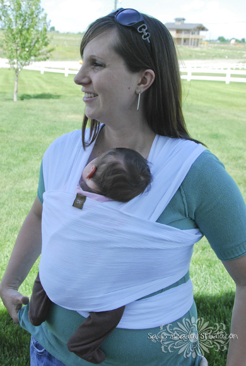 Kayla and her girls came over for a quick visit this afternoon. She’s been looking for a baby sling that will be comfy for the hot summer months, and (because I”m a fabric-hoarding freak) I just happened to have a LOT of this light-weight cotton gauze sitting in my family room. We figured out how to wrap the 5 1/2 yard length of fabric, then I serged the edges, and finished it off with a sweet little monogram for Baby Kaymn.
