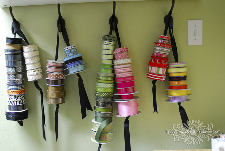 I was in dire need of a good way to visually store my ribbon stash, and when I saw this storage idea in a recent issue of Creating Keepsakes, I knew I’d found it!