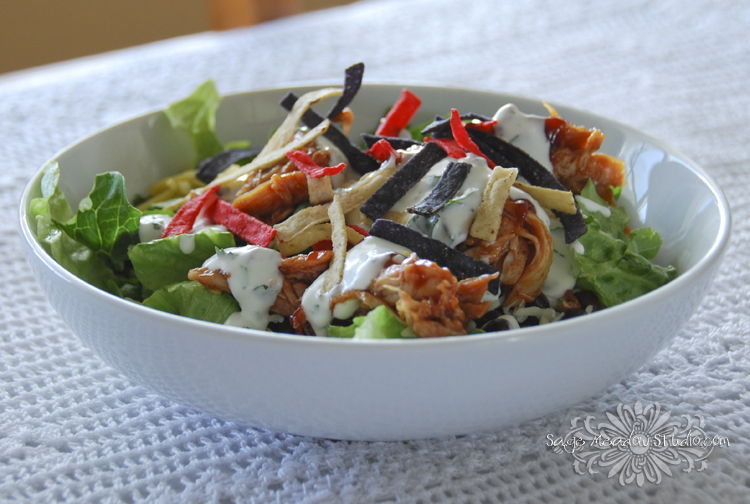 Prepare the chicken by covering it with BBQ sauce after it is cooked and chopped, and let it chill in the refrigerator. Chop the lettuces into strips and combine with chopped cilantro and basil. Stir in corn, beans, and cheese. Just before serving, stir in about 1 cup of tortilla strips and toss with a small amount of ranch dressing. Top the salad with the BBQ chicken and drizzle the salad with a little extra BBQ sauce.