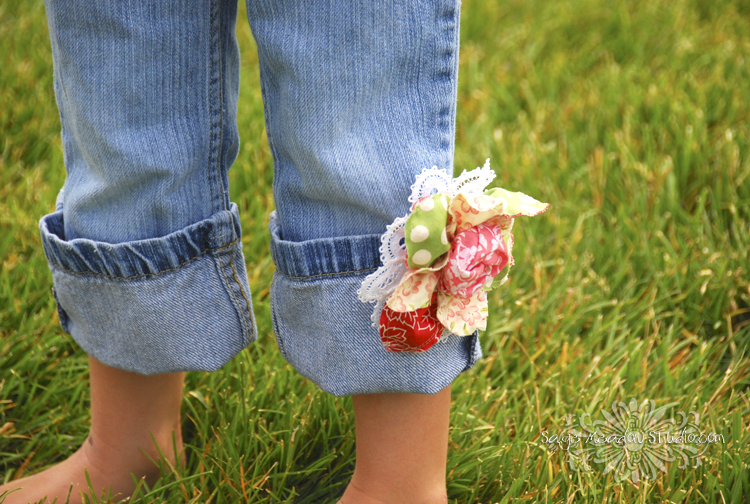 More on my continuing quest to re-purpose long pants for summer: these little crops can’t be more simple: take a pair of too-short jeans (can you tell we’re a jeans family?), fold and stitch the cuffs in place. To dress them up, add a pretty fabric flower pin–this little idea makes my head spin with all the possibilities…you can have custom-looking pants, skirts, whatever for any occasion using anything you want!